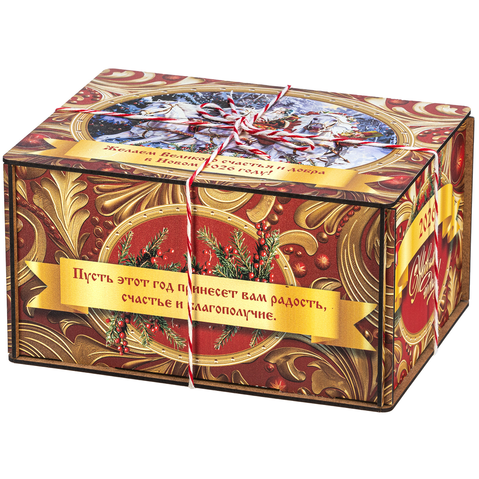 Новогодние сладкие подарки в деревянной упаковке уже не первый год являются хитом продаж - ведь они сочетают в себе практичность и прекрасный вкус кондитерских изделий. “Золотые узоры” - подарочный набор в деревянном ящичке, перевязанном разноцветной ручкой шнурком. Набор преимущественно выполнен в сочетании разных оттенков красного и золотого цветов, что придает ему солидный и торжественный вид. На крышке крышке изображена контрастная иллюстрация: Дедушка Мороз несется по заснеженному лесу на упряжке белоснежных грациозных лошадей. Такой подарок прекрасно подойдет как для поздравления ребенка, так и для взрослого.